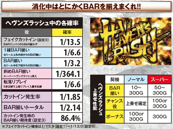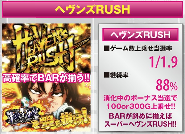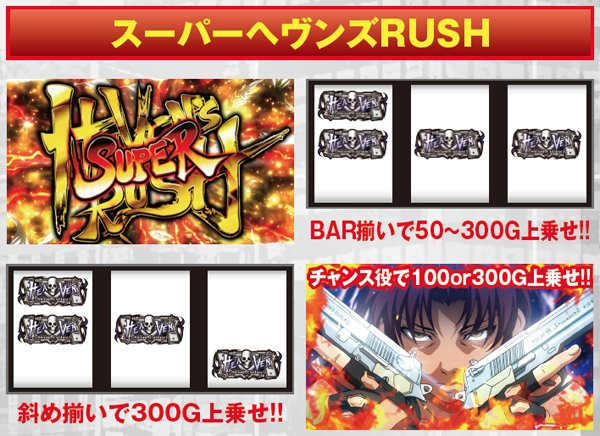 ヘヴンズRUSHは超高確率でBAR揃いに期待でき、BARが揃うたびにゲーム数上乗せが発生。転落リプレイが揃うまで上乗せが発生する。ヘヴンズRUSH中にBARの斜め揃いとなれば、その上位版であるスーパーへの格上げが確定する。