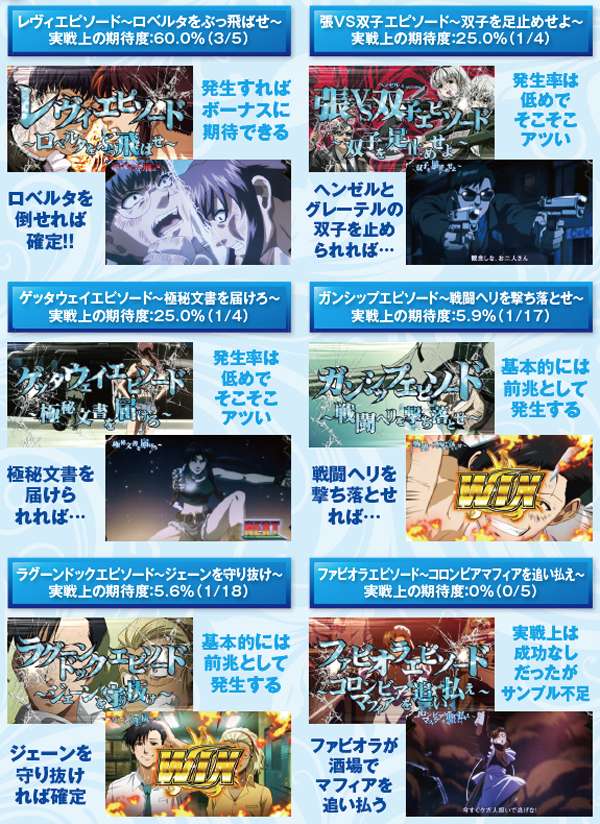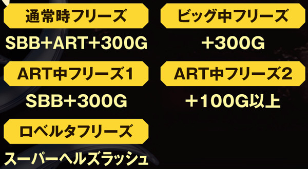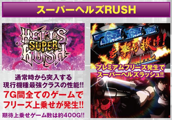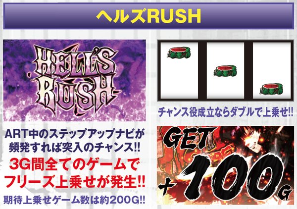 ヘルズRUSHは3G継続だが、3G全てでフリーズ上乗せが発生するという優れモノ。平均上乗せゲーム数は200Gにも及ぶため、大爆発へのトリガーと成りうるだろう。スーパーヘルズRUSHはプレミアムのロベルタフリーズから突入し、7G全てで上乗せが発生する。