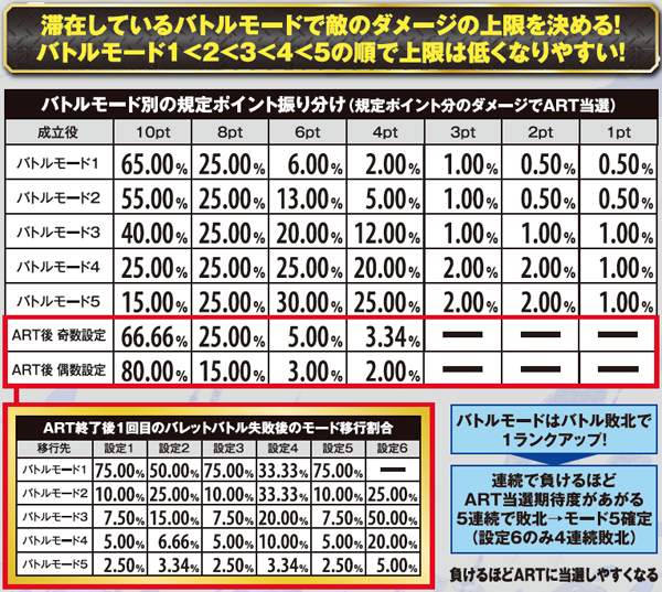 対戦キャラのART当選までの規定ポイントは、滞在しているバトルモードに応じた振り分けで決定される。設定6はART終了後に発生するバレットバトルに敗北しても、バトルモード1を選ばず、高バトルモードを選択しやすいので、バレットバトルからARTに当選しやすい傾向にある。