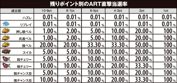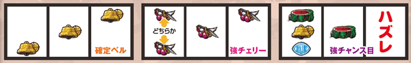 ARTの直撃当選は基本的にはレアで、低確や通常では中段チェリー以外、ほとんど期待が持てない。高確中の強ベルや中段チェリーならチャンスあり。