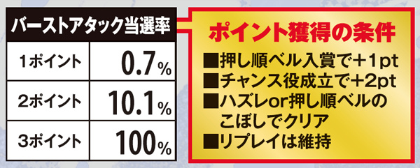 押し順ベル入賞の次ゲームにチャンス役を引くなど、ハズレとベルこぼしでポイントクリアになるまでに内部的に3ポイント(ダメージポイントとは別)貯めることができればバーストアタック発生となる。