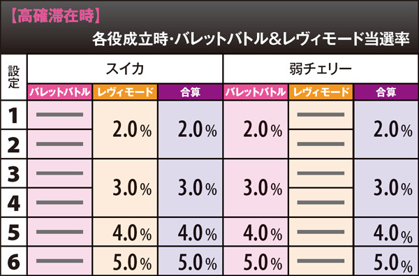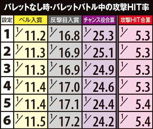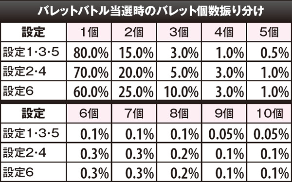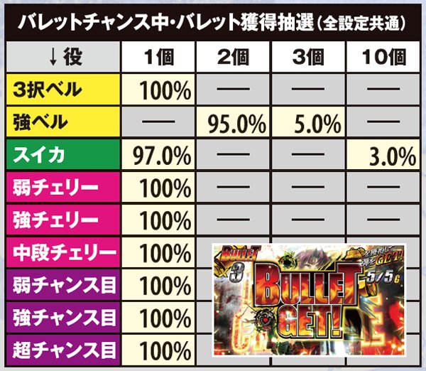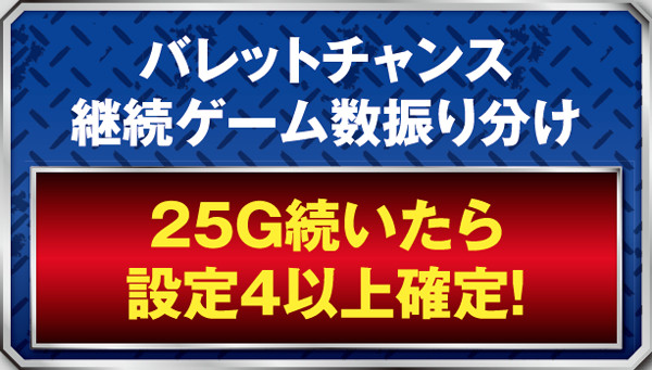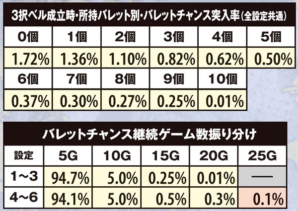 バレット獲得の特化ゾーン「バレットチャンス」は現在のバレット所持数に応じて、3択ベルと強ベルで抽選。設定4以上は15G以上の継続振り分けが設定3以下に比べて優遇されている。