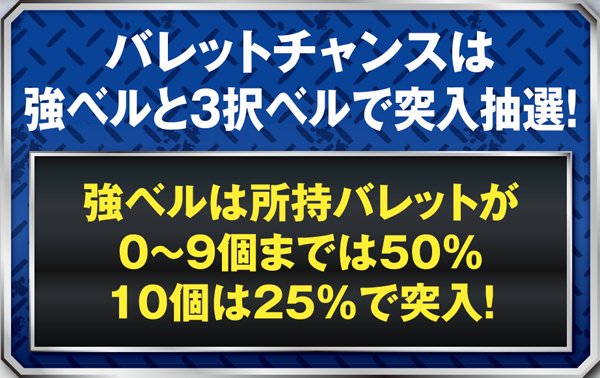 フルバレット時もバレットチャンス抽選は行われており、バレットチャンス中は3択ベルとチャンス役で必ずゲーム数を上乗せする。