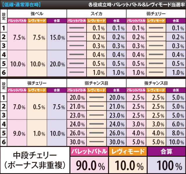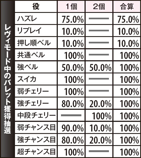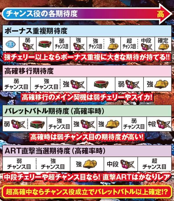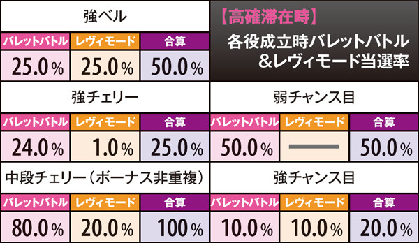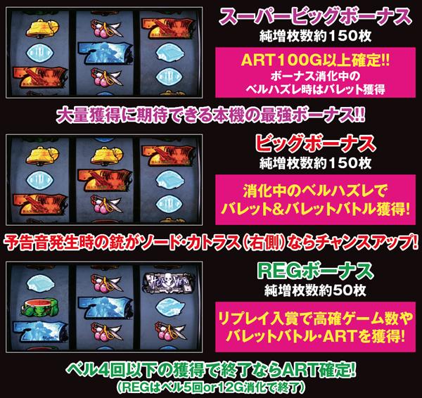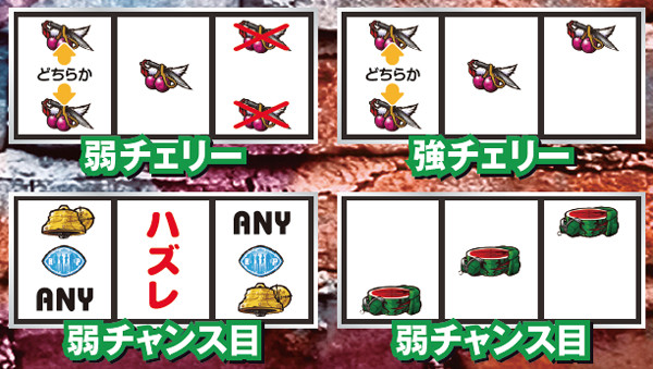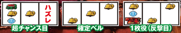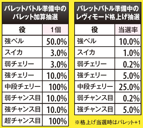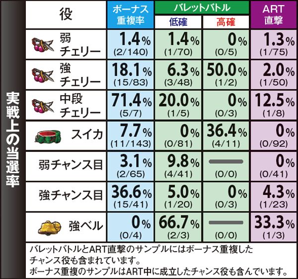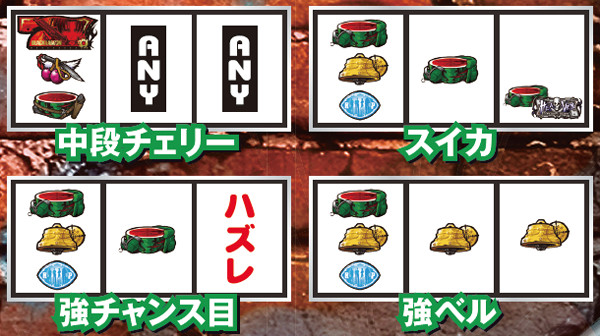 確定役以外では中段チェリーが最も期待でき、実戦上ではボーナスまたはARTが確定。続いて強チャンス目、強チェリーの順にボーナス期待度が高まる。強チャンス目はバレットバトルの突入にも期待できるため、ボーナス非重複となった場合も即ヤメは厳禁だ。
