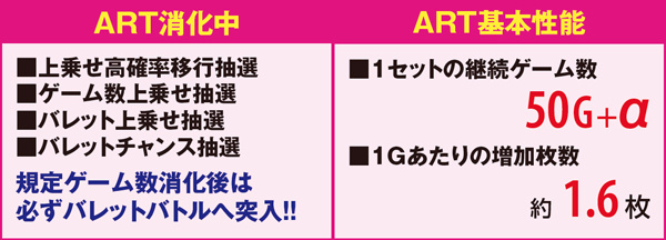 バレットバトル勝利後のART準備中にもバーストアタックが発生する可能性があり、ここでは3択に成功するたびにゲーム数上乗せが確定する。最大の5回成功すればトータル100Gの上乗せとなるので、ART開始時には最低でも150Gスタートとなる。
