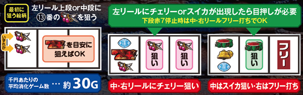 まずは左リールの赤7を目安にチェリーを狙う。左リールの角にチェリーが停止した場合は中&右リールにもチェリーを狙い強弱を判断したい。3連チェリーとなれば期待度の高い強チェリーとなる。また、左リールがスイカまでスベった場合は、中リールにスイカ狙い→右リールフリー打ちでOK。スイカがハズれれば強チャンス目や強ベル、超チャンス目といった期待度の高いレア役が確定する。