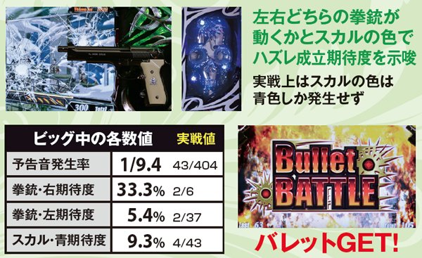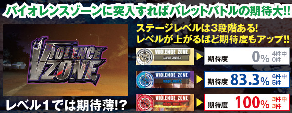バイオレンスゾーン中はステージのレベルに注目。押し順ナビ時にレベルアップの可能性があり、レベル2で83.3%、レベル3ならば100%でバレットバトルへと結びついている。なお、実戦上では直撃ART時にもバイオレンスゾーンを経由したケースを確認した。