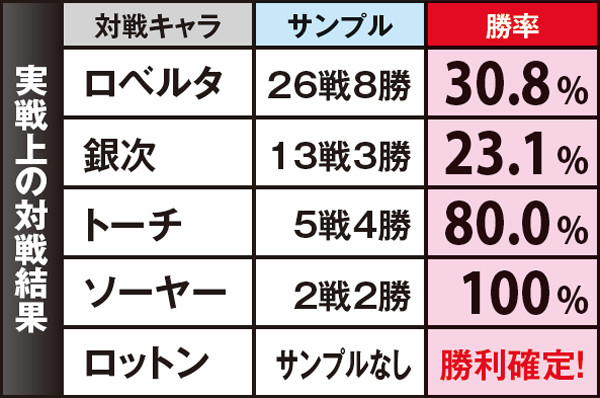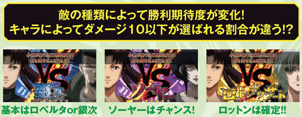 対戦キャラは重要でロベルタや銀次相手だと、勝利には大量のダメージが必要となる。バレットの残弾がわずかならば、ボーナス成立に期待したい。ただし、強キャラが選択された場合でも、ダメージ10以下での勝利が選ばれている可能性もあるため最後まで諦めは禁物だ。