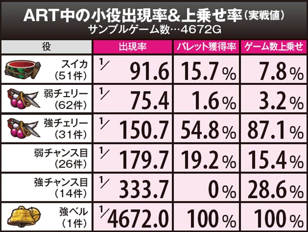 ART中のチャンス役はボーナスはもちろん、バレットの獲得やゲーム数上乗せ、高確移行契機になっている。