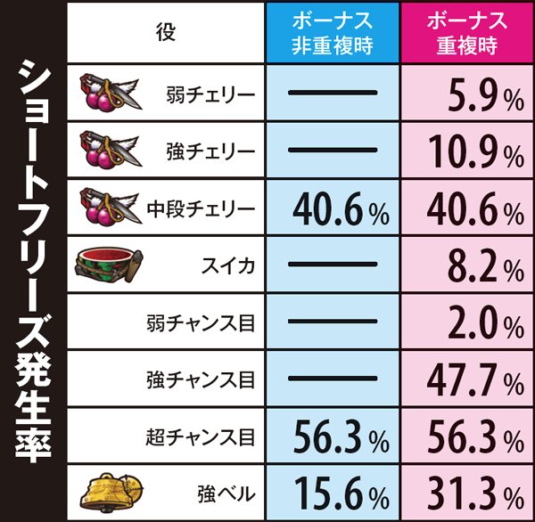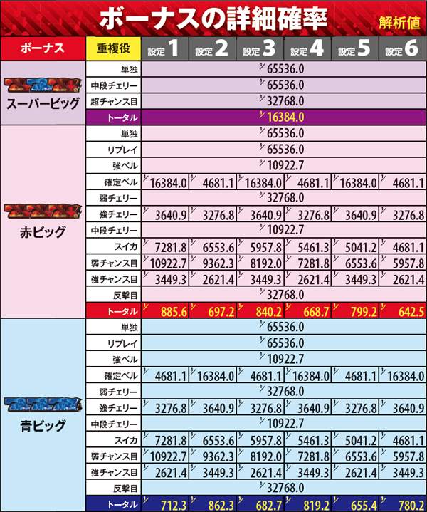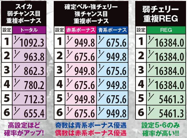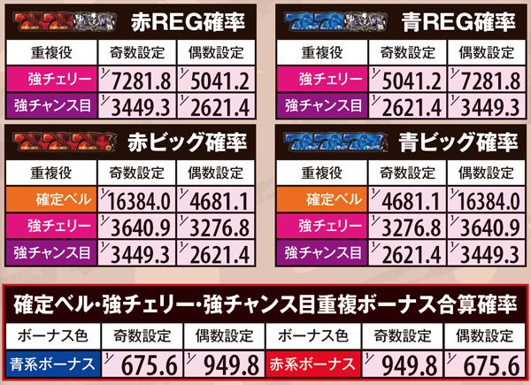確定ベル・強チェリー・強チャンス目重複ボーナスは、奇数・偶数設定で特徴があり、奇数なら青系のボーナス、偶数なら赤系のボーナス確率が優遇されている。強チェ&強チャンス目重複ボーナスは何度か引いて判断すべきだが、確定ベル重複ビッグは青なら奇数、赤なら偶数と決めつけたいレベルの設定差である。
