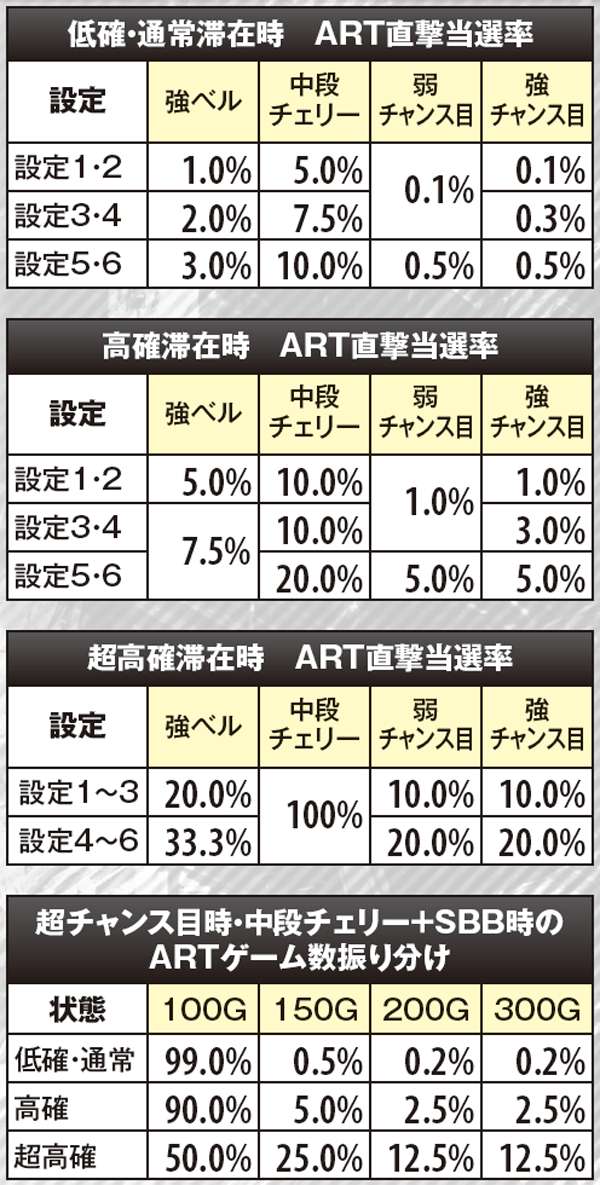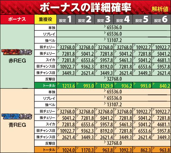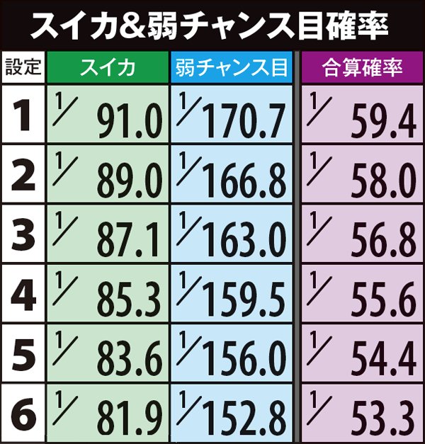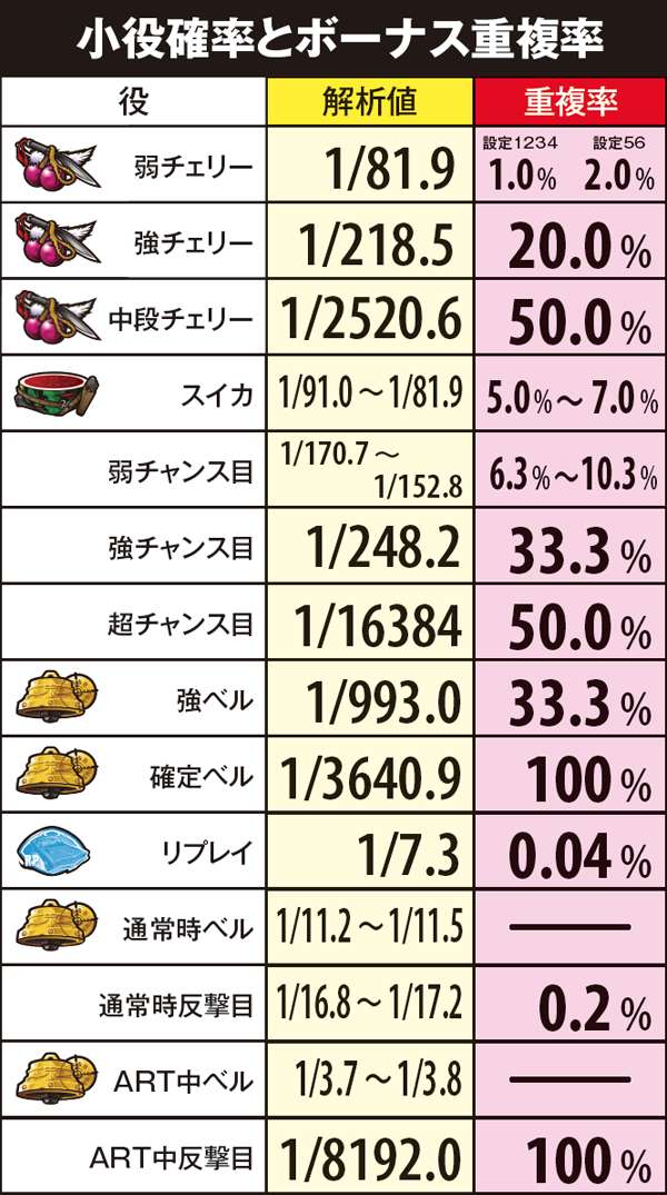 最も注目したいのはスイカ・弱チャンス目重複のボーナス確率。高設定ほど確率が高まるため要チェックだ。また、確定ベル・強チェリー・強チャンス目重複は、奇数・偶数設定でどちらの色のボーナスが成立しやすいかが異なる傾向がある。弱チェリー+REGは設定5・6のみ優遇されるという点も覚えておきたい。