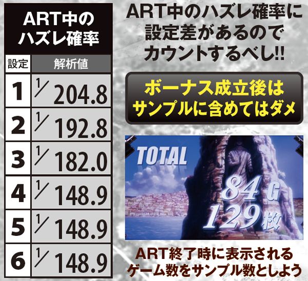 ART中のハズレには設定差があるため必ずカウント。150分の1以上で出現するようなら高設定の期待が高まると覚えておこう。ただし、ボーナス成立後のハズレを誤ってカウントしないように注意したい。リールフラッシュを伴った場合もチャンス目となる。