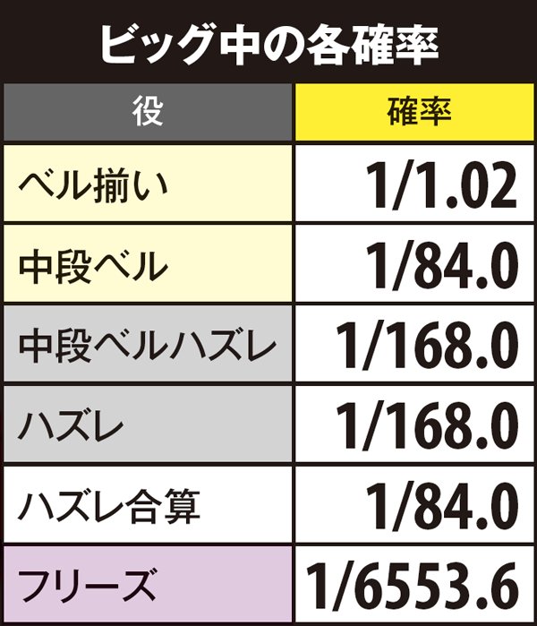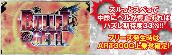 ビッグ中にハズレが出現すればバレット獲得となるわけだが、その確率は84分の1。最低でもビッグ1回で25Gを消化できるため、ビッグの約3.3回に1回の割合で出現する計算だ。ちなみにベルの中段テンパイがアツく、中段ベルハズレは1枚の払い出しとなる。