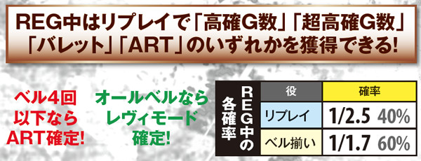 REGはベル5回または12ゲーム消化で終了となり、ベル4回以下でREGが終了すればARTの当選が確定。基本的にリプレイが成立するほどチャンスとなるわけだが、オールベルだった場合は消化後のレヴィモードが約束されるという特典がある。