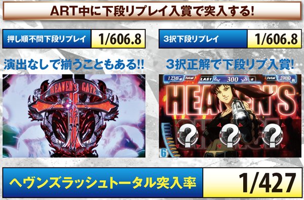 ヘヴンズラッシュの突入契機は下段リプレイ揃いとなるのだが、「押し順不問」と「押し順3択」の2種類のフラグがある。ヘヴンズチャンスが発生した場合はカンを研ぎ澄ませて3択に挑戦したい。