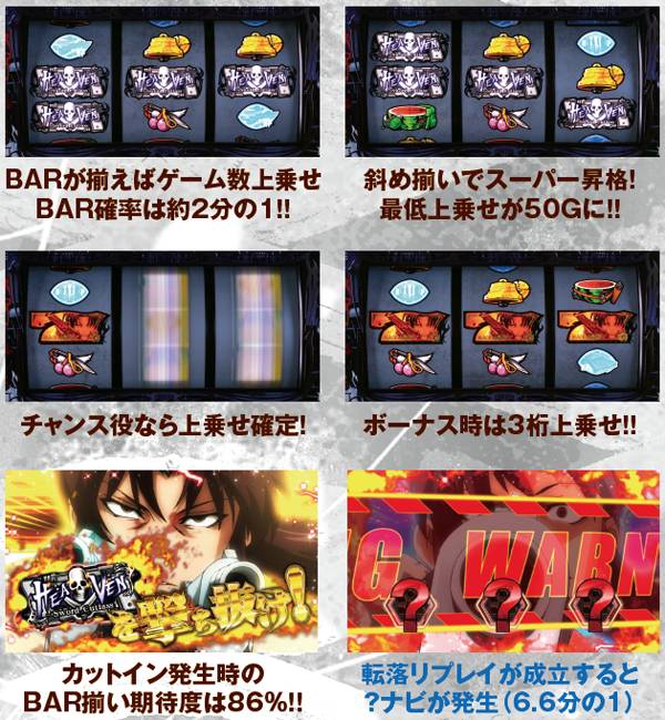 最低1回のBAR揃いが保証されるため、BAR揃い前に転落リプレイが成立した場合はナビが発生して必ず回避することができる。また、斜めBAR揃いとなった場合は、毎ゲーム50G以上の上乗せに期待できるスーパーへの格上げが確定。その確率は364分の1と、なかなか引けるものではないが、引いた際の見返りは平均400Gの上乗せだ。