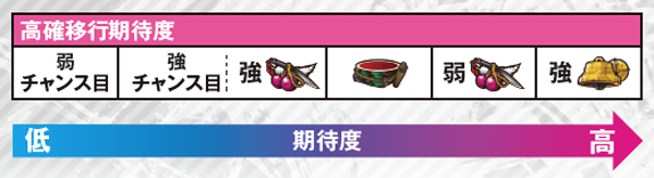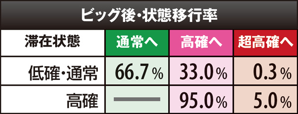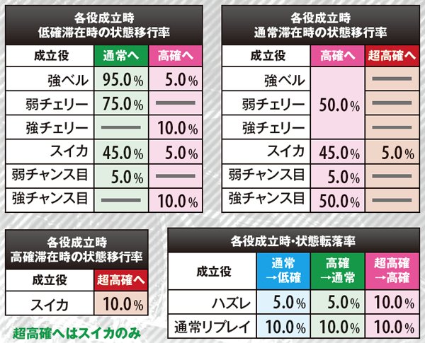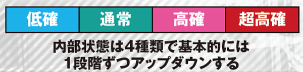 状態には4種類あり、基本一段階ずつアップもしくはダウンしていく。アップのメイン役は弱チャンス役のスイカと弱チェリー。低確もしくは通常滞在中ならば、2分の1以上で一段階以上アップすることになる。