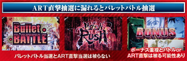 チャンス役が成立するとまずはARTの直撃抽選が行われ、それに漏れるとバレットバトルの抽選が行われる仕組み。この抽選はボーナス重複時にも行われるので、ボーナスとART、ボーナスとバレットバトルに同時当選している場合もある。
