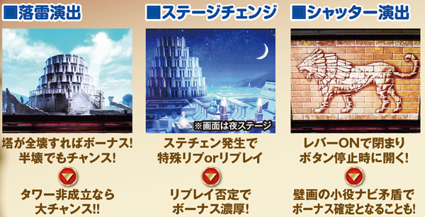 落雷演出は発生するだけでチャンスだが、ハズれる時にはほぼタワーが成立。つまり左リールでタワーを否定した時点で大チャンス。壁画演出には時々壁のみ=ハズレ対応がある。その時に小役が成立していれば…もちろんボーナス確定!