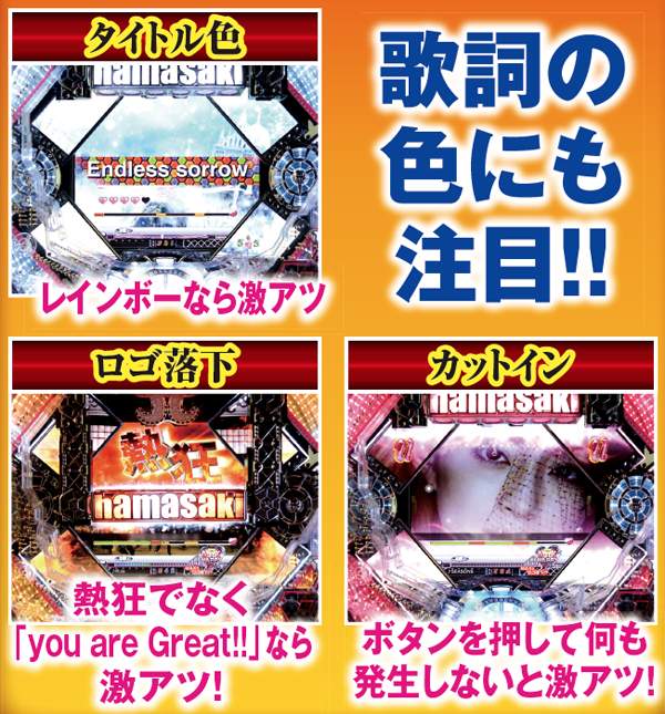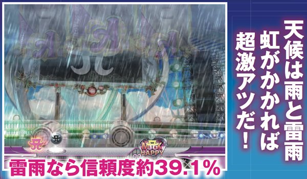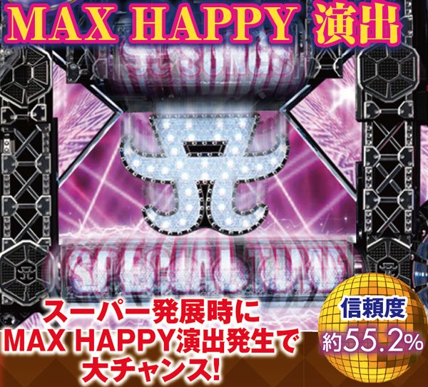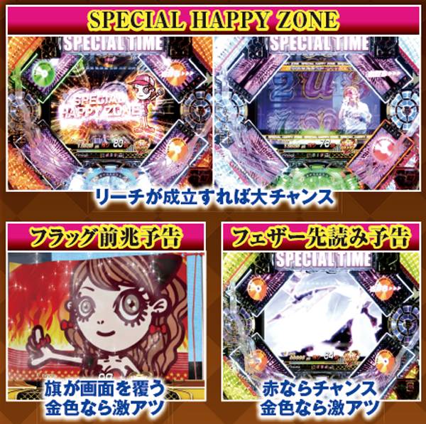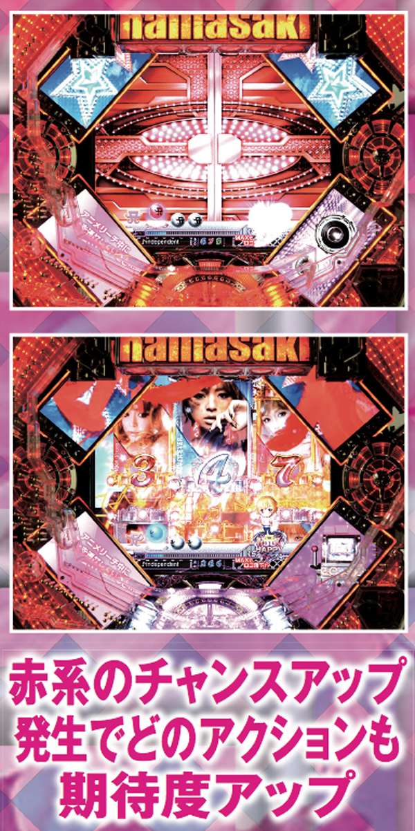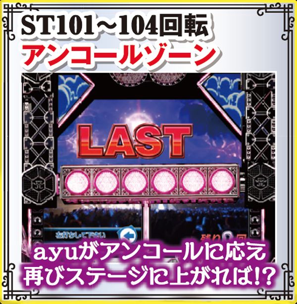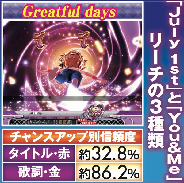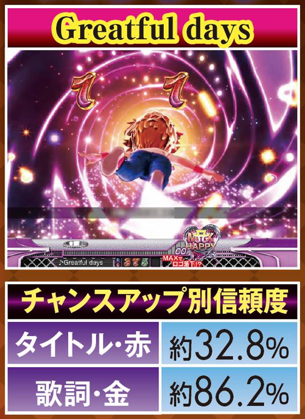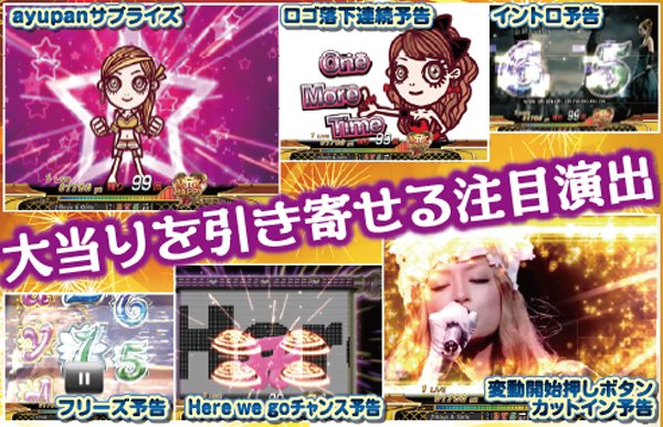 スーパーリーチ発展時は要注目。実写のayuが登場するパターンや、インパクトフェザーなら大チャンス。それ以外の発展パターンでも、扉やライトの色が赤く変化することに期待しよう。いずれも最終的に上部の役モノが落下するMAX HAPPY演出の発生で、半数以上が大当りに!