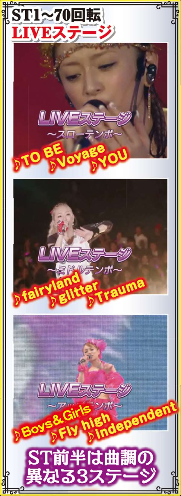 104回転のSTは4段階で構成されており、メインとなるのはLIVEステージで、テンポの違う楽曲群ステージが3つある。