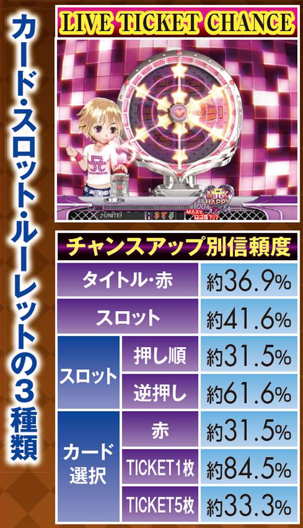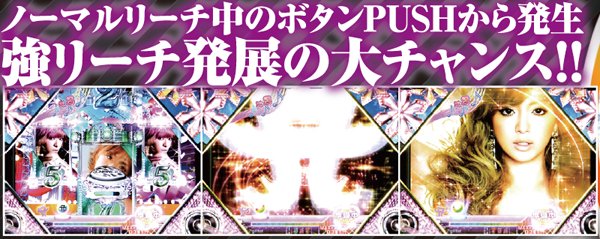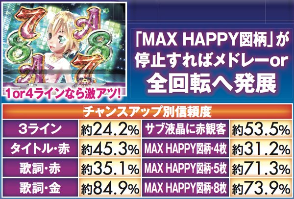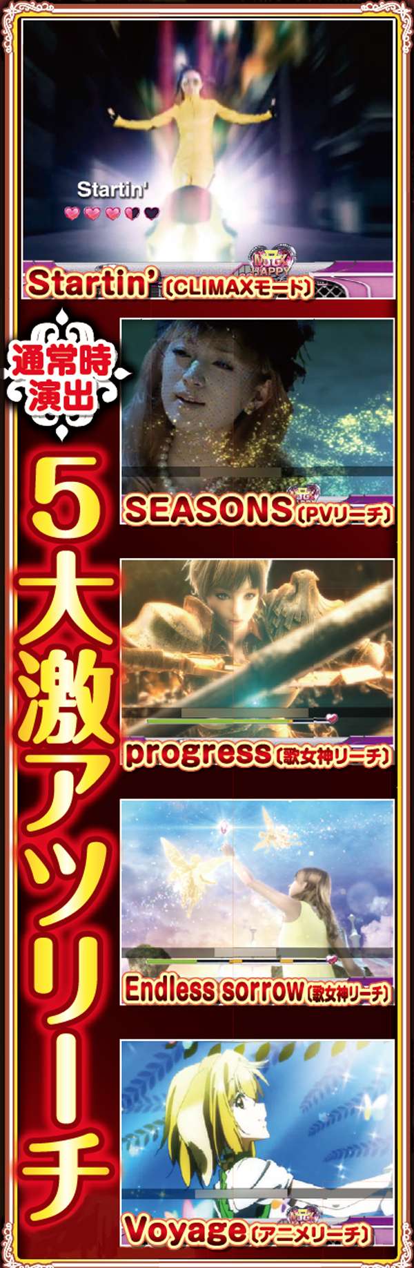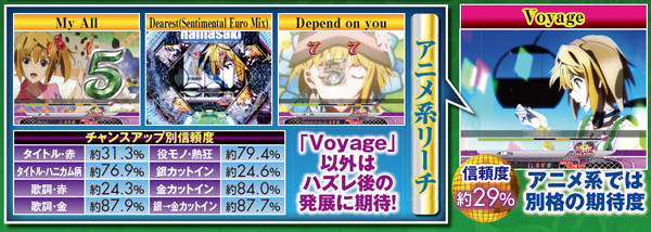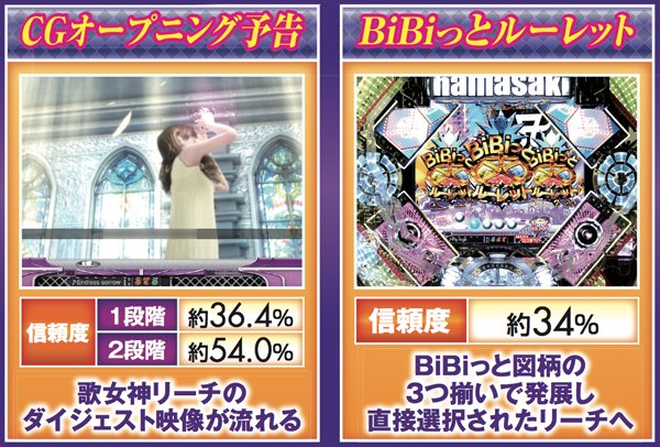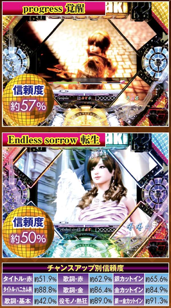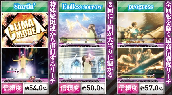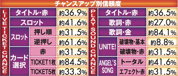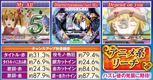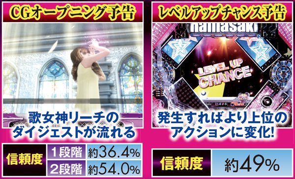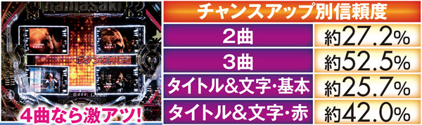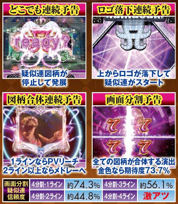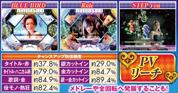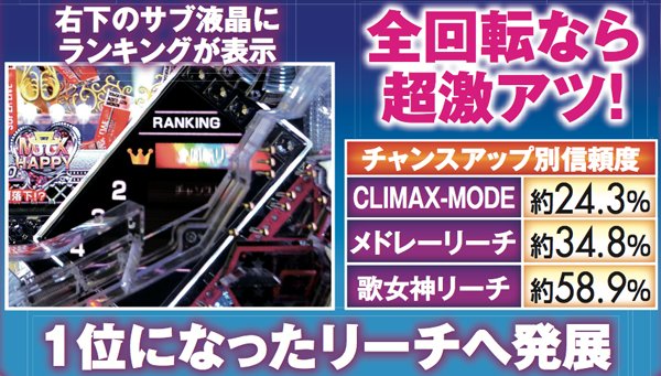 PVが連続的に流れるメドレーリーチは、曲目よりも曲数に注目。多いほど信頼度は上がり、赤文字の発生で大チャンスに。