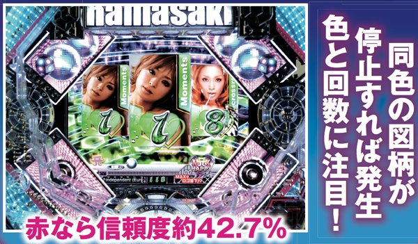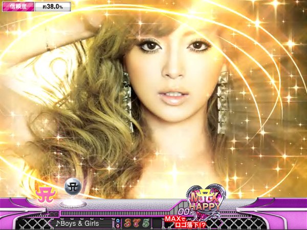 平成の歌姫、浜崎あゆみがミドルSTスペックで登場。 突入率100%、継続率68.2%のST中は大当りの52%で16Rを獲得でき、初当りは全て16Rとなるのが大きな特徴だ。 |