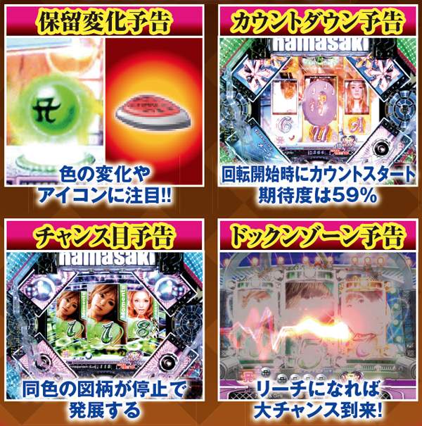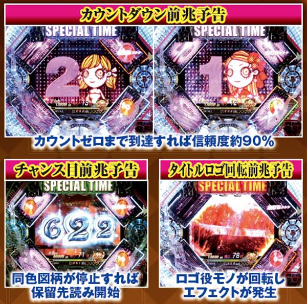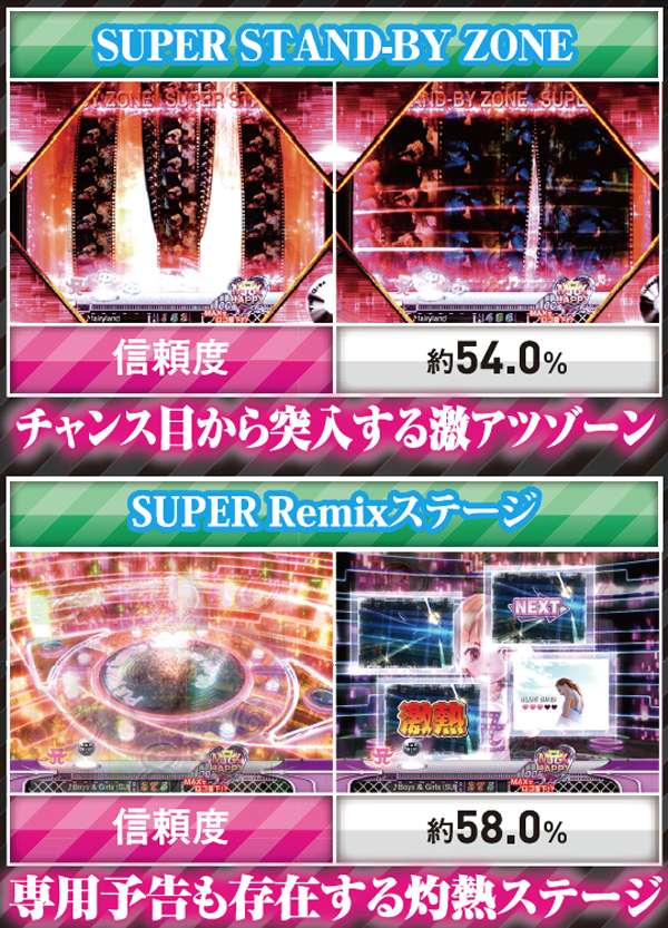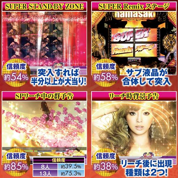 先読みの「SUPER STAND‐BY ZONE」と、「SUPER Remixステージ」は突入時点で半数が大当りに繋がる重要予告。リーチ時背景予告は2種類あり、それぞれ信頼度を底上げしてくれるぞ。また、SPリーチ中に発生する激アツの群予告は、右上で待機するAマークの人数が多いほど発生期待度アップ!