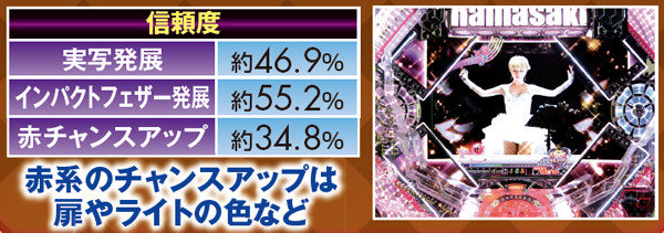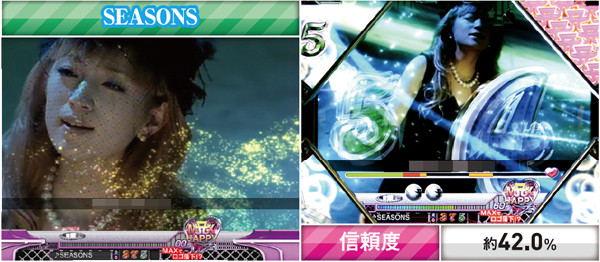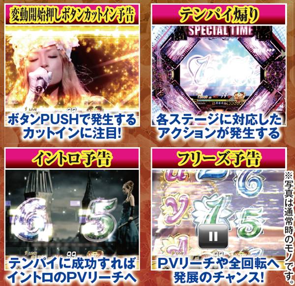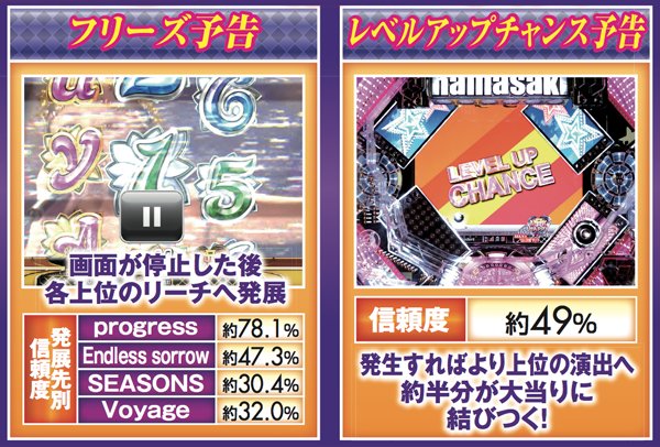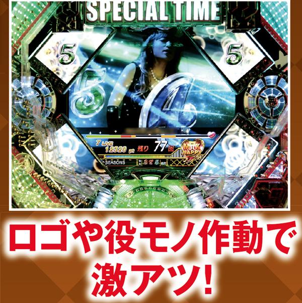 チャンスアップが多彩で、赤系の演出発生で最低でも約4割が大当りに。カットイン以外の赤系演出なら約7割が、それぞれ大当りに繋がるぞ。また、イントロ予告ではテンパイ成功で対応したPVリーチへ発展するため、最アツとなる「SEASONS」発生に期待しよう。