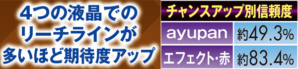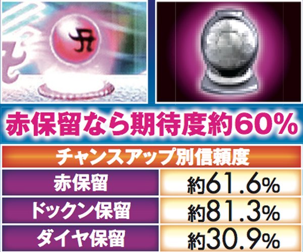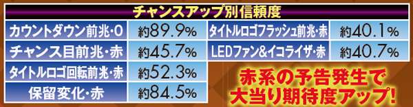 予告と同様に、リーチアクションでも赤系のチャンスアップは重要となる。基本的に低信頼度なロングリーチでも赤タイトルなら約30%が大当りに繋がる点を見れば、その重要度は一目瞭然だろう。どのリーチでも、最低一つはチャンスアップが欲しいところだ。