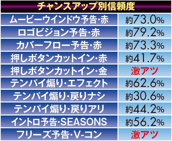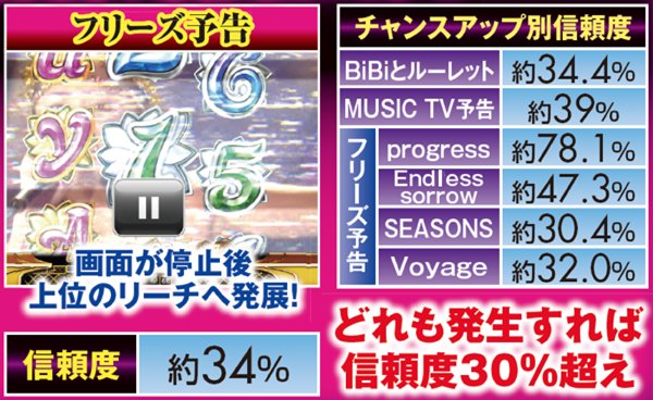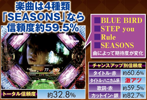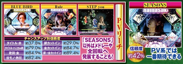 全4曲あるPVリーチは、「SEASONS」なら連チャンに繋がる大チャンス。それ以外でも、チャンスアップが発生すれば信頼度は一気に跳ね上がる。