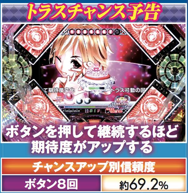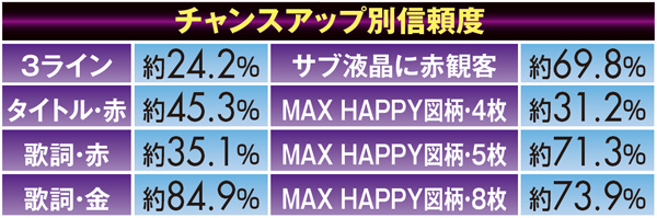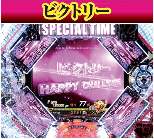 ボタンを使用する3つのHAPPYチャレンジは、ビクトリーなら約55.3%が大当りに繋がる。いずれも赤系のチャンスアップに期待しよう。