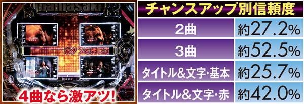4つのサブ液晶と連動し、表示された楽曲の数だけチャンスが訪れるため、最低でも3曲は欲しい所。