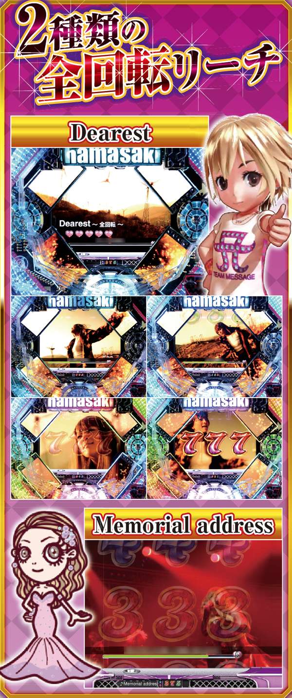 「Dearest」のPVと「Memorial address」のライブ映像が流れる感動必至のナンバーは、それぞれ全回転リーチで大当りが濃厚になる。そのリーチ中にレバーを操作すれば、役モノがフル駆動し、16R確変を祝福してくれるぞ。