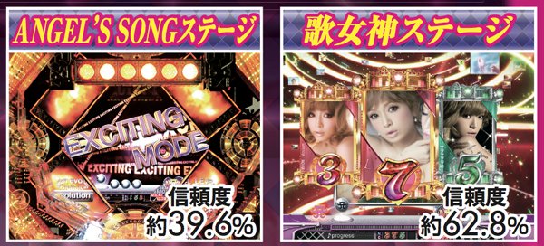 他機種に比べてステージ背景が豊富に存在する本機だが、中でも重要なのは2つ。まずST終了後に突入する「ANGEL’S SONGステージ」へ、通常時に突入すれば約4割が大当りに。また、歌女神ステージは、その名の通り歌女神系リーチへの発展を示唆しているので、激アツだ!