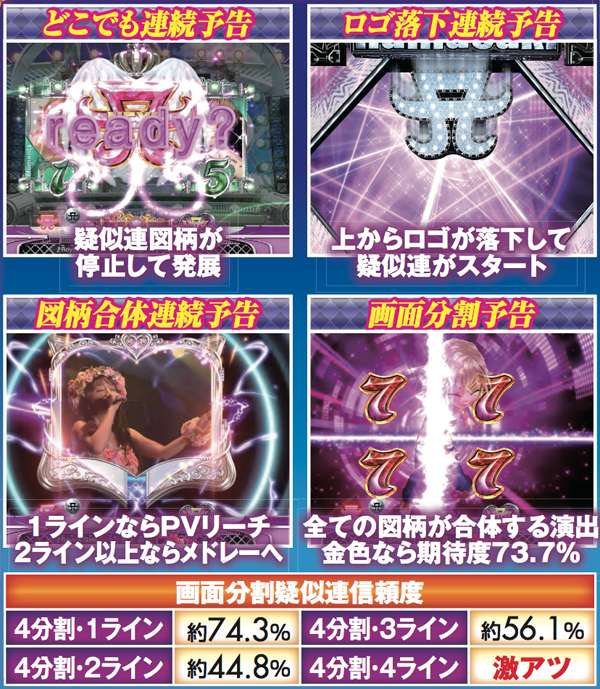 複数ある疑似連は、その内容によって信頼度が激変。画面分割予告は4ライン全てテンパイする形が最も期待できるが、逆に1ラインのみのテンパイで灼熱と化す。図柄合体は金に期待!