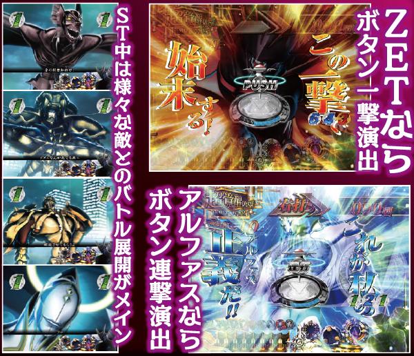 姿も性格も出自も異なる2人のヒーローが活躍する原作の世界観を活かし、本機のST中もZET&アルファスのアクションが満載となっている。 通常時8個保留を採用しており、ヘソ入賞でも高いST突入率62.5%を実現しているのも魅力。 ST150回転「超覚醒RUSH」の連チャン率は約77.1%だ! |