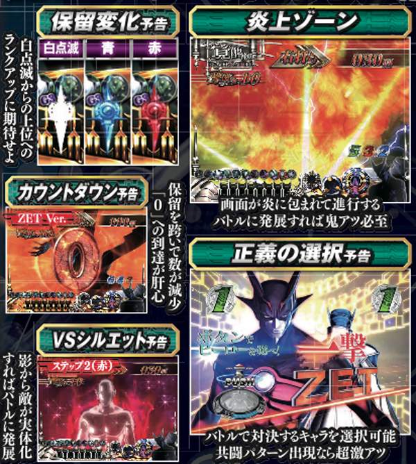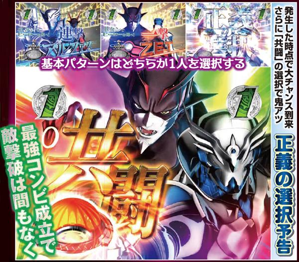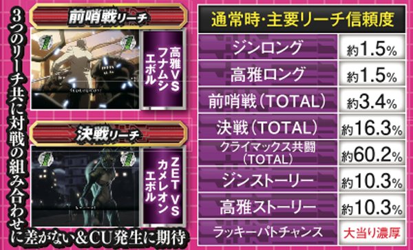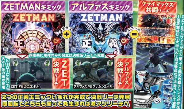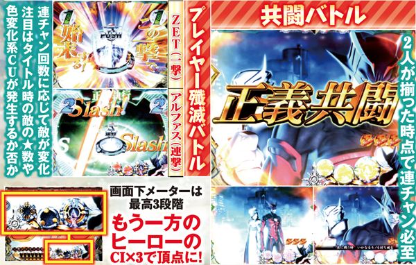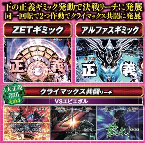 片方の正義ギミックのみ作動なら、ヒーロー単体で敵と闘う「決戦リーチ」へ、同一回転内に2つの正義ギミックが作動すれば、初当り獲得の軸となる激アツの「クライマックス共闘リーチ」へ発展。後者には2回の攻撃チャンスがあり、1回攻撃成功で大当り、2回攻撃成功で大当り+ST突入が濃厚となる。