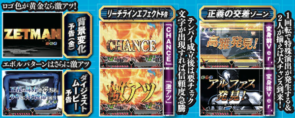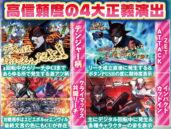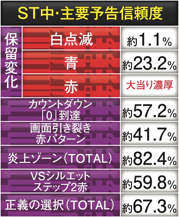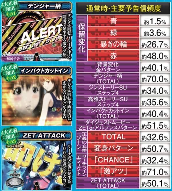 4大正義演出の内、3つが該当する予告はどれもハイチャンスで、特にデンジャー柄のTOTAL信頼度は70%と安定の高水準をマーク。その他注目すべき信頼度50%超の予告はダイジェストムービー・ZETorアルファスパターン、正義の交差ゾーン・変身後パターン、リーチラインエフェクト・「激アツ」の3種類となっている。