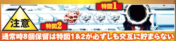 本機は通常時8個保留を採用。しかし、一般的な8個保留機とは異なり特図1と特図2の入賞順が一定ではなく、片方の保留に偏ることもある。そのため、どちらかが4個貯まった状態のオーバー入賞には十分に注意しよう。