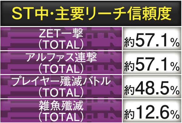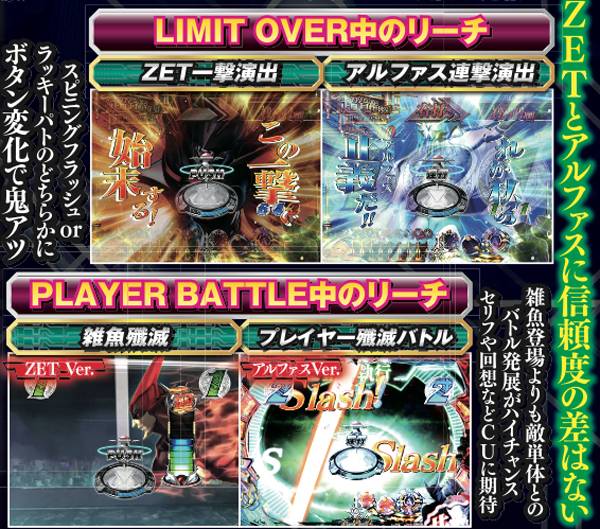 RIMIT OVER&PLAYERBATTLEのメインリーチは共に、ZET・アルファスに信頼度の差がなく、どちらも発展時点で信頼度は約50%。加えて保留先読みやボタンの種類で期待度が変化する。全体的に赤系演出の信頼度が高いため、そちらも併せて覚えておこう。
