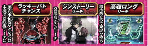 いくら決戦まで発展しようがヒーロー単体では期待薄。対戦相手の種類にも信頼度差は存在しないので、いかにギミック同時発動、即ち期待度6割のクライマックス共闘リーチに発展するかが唯一最大のカギとなる。