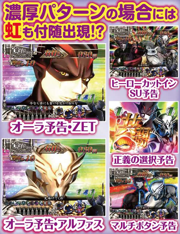 登場キャラのまとうオーラや名セリフ系の文字、背景などで「虹」の発生する場合がある。アツそうな演出が登場したら画面の一部でも、色が変化していれば期待してヨシ!
