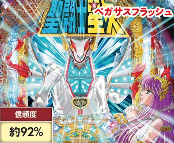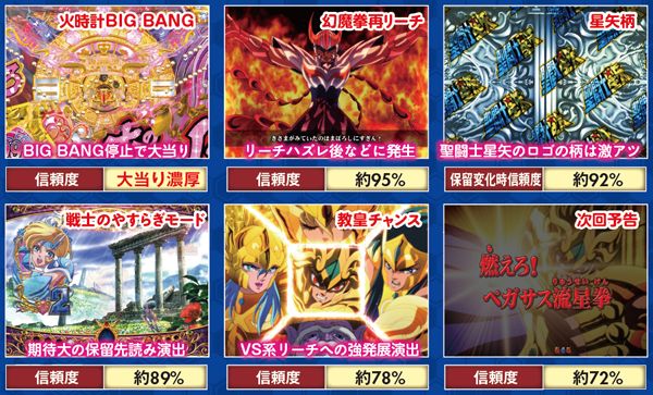 遊パチだけに7大チャンス演出はマジでアツい。ペガサスフラッシュや星矢柄、幻魔拳再リーチなら実に90%オーバーの信頼度だ。