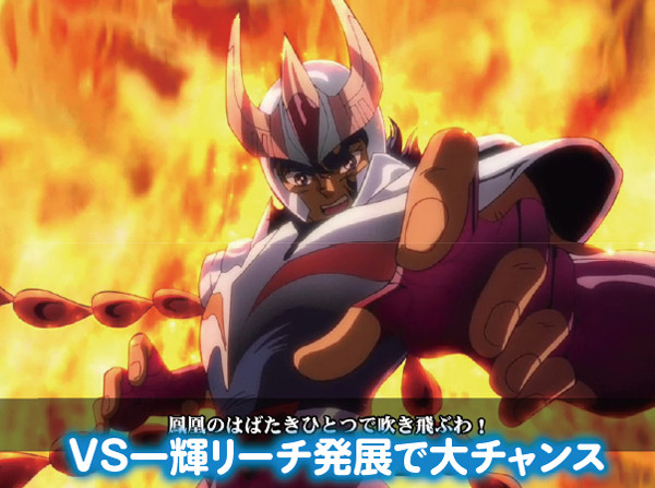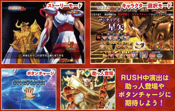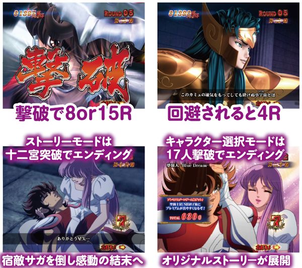 ストーリーモードはアニメの組合せでバトルが展開。キャラクター選択モードは好きな聖闘士を選んで勝ち抜いていく。演出では助っ人登場で大チャンス。リーチではボタンチャージがアツい。
