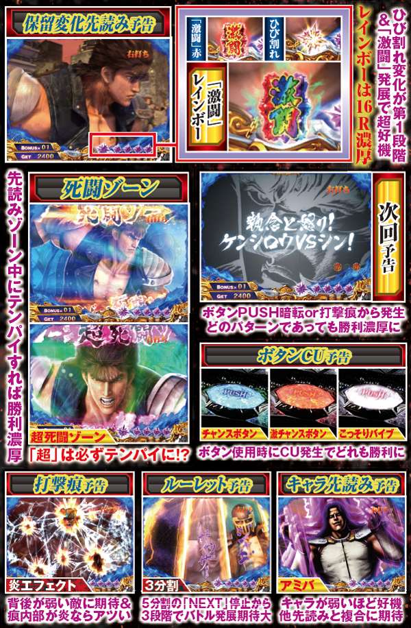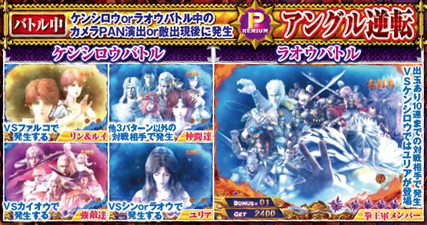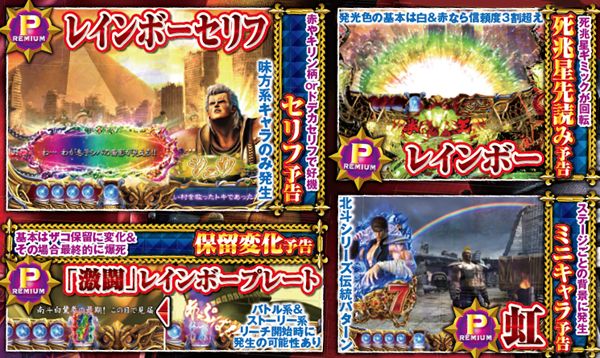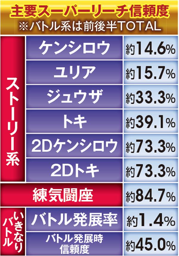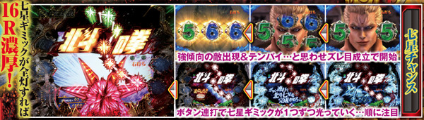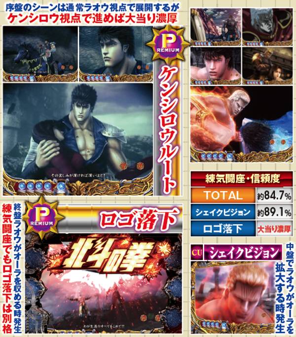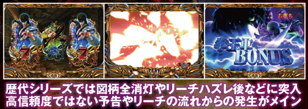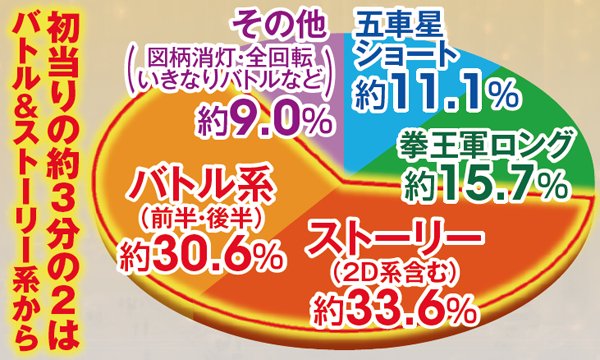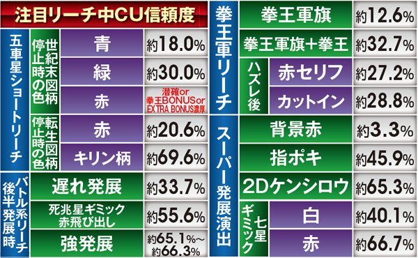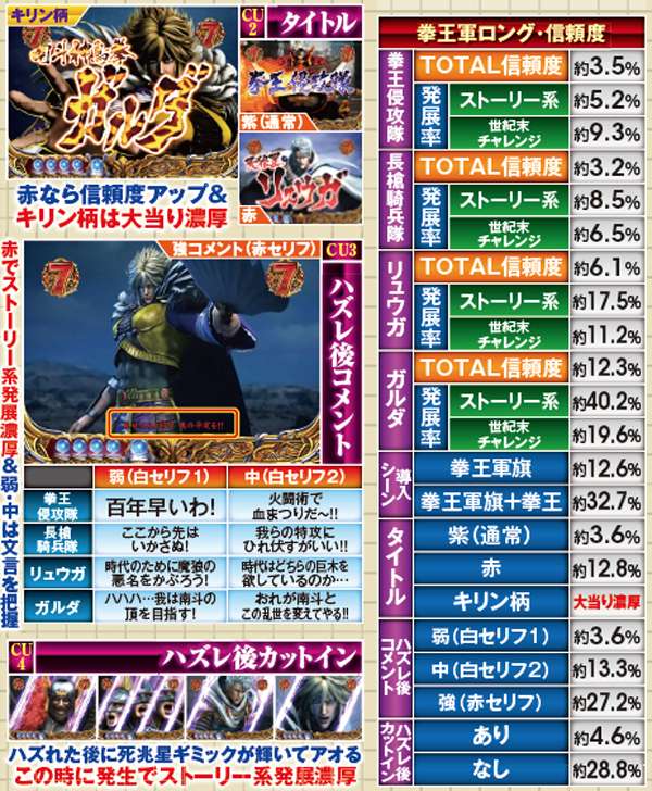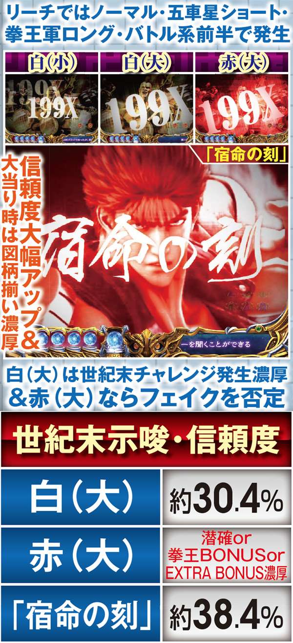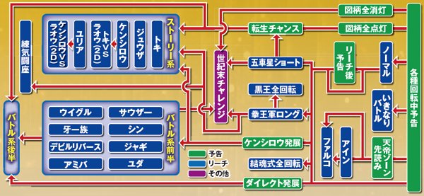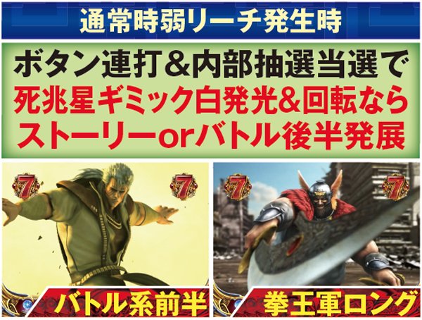 左右図柄テンパイから発展するリーチは実に多彩。最も望ましいのは図柄揃いのメインの契機となり、初当りの3分の2を占めるバトル系&ストーリー系への発展だ。しかし、五車星ショートや拳王軍ロングなど信頼度の低い傾向にある部類でも、上位リーチへの発展や世紀末チャレンジを経て拳王BONUSや潜伏確変に当選する可能性が十二分に残されているのだ。