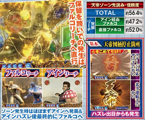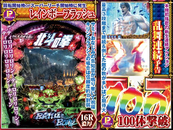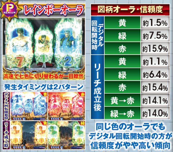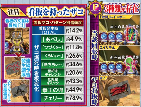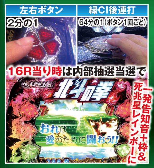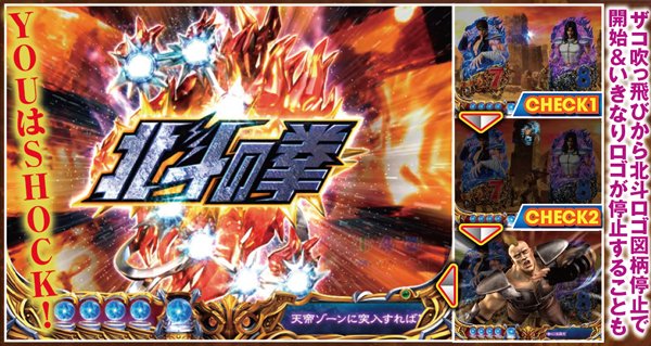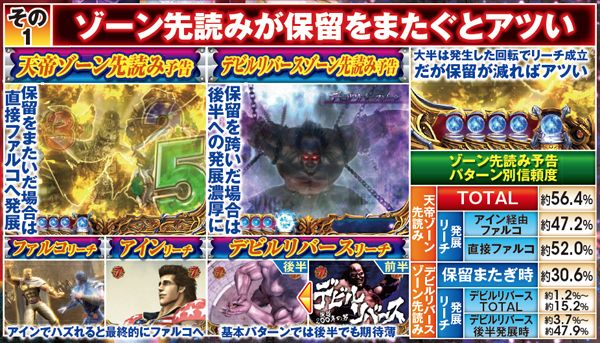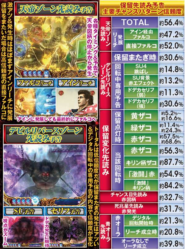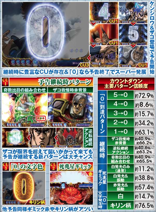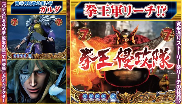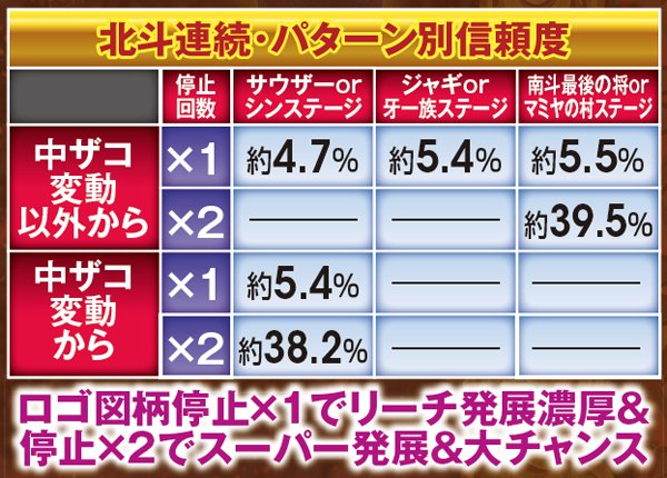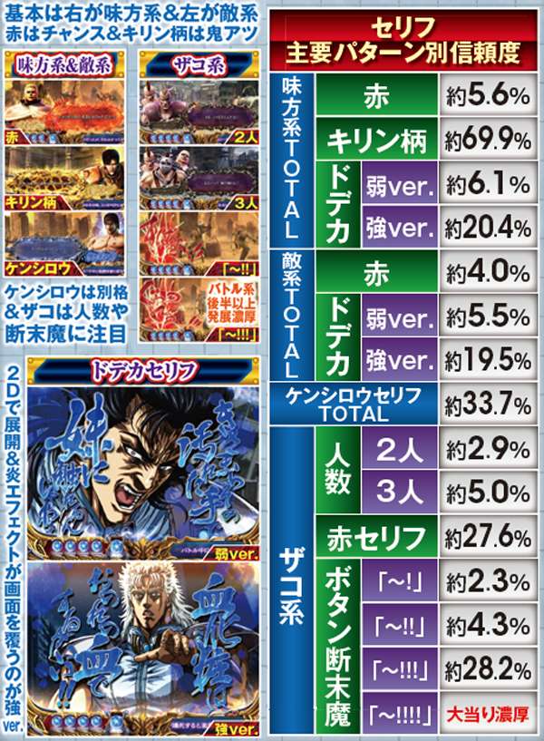左右図柄テンパイから発展するリーチは実に多彩。最も望ましいのは図柄揃いのメインの契機となり、初当りの3分の2を占めるバトル系&ストーリー系への発展だ。しかし、五車星ショートや拳王軍ロングなど信頼度の低い傾向にある部類でも、上位リーチへの発展や世紀末チャレンジを経て拳王BONUSや潜伏確変に当選する可能性が十二分に残されているのだ。