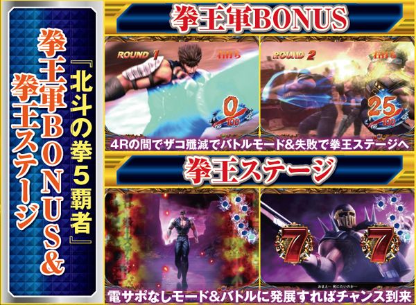 本機『拳王』に搭載されている2種類の特殊モードは、従来シリーズに存在したモードの流れを汲んで継承されている。また、本作の「拳王ステージ」は同じ名称ながら『覇者』とは異なり、電サポありとなっている点が見逃せない。引き継がれただけでなく、極限まで進化しているのだ。