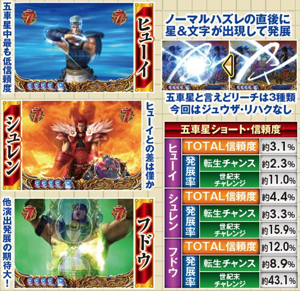 ノーマルハズレ後に発展する五車星ショートリーチは、シリーズ4作目の『剛掌』から2パターン減少して全3種類。それぞれテンパイ図柄の停止をアオるが、ここでの直当りは稀。特殊図柄停止からの転生チャンスや世紀末チャレンジ発展に期待しよう。中でもフドウなら半数以上で特殊図柄が停止する好機だ。