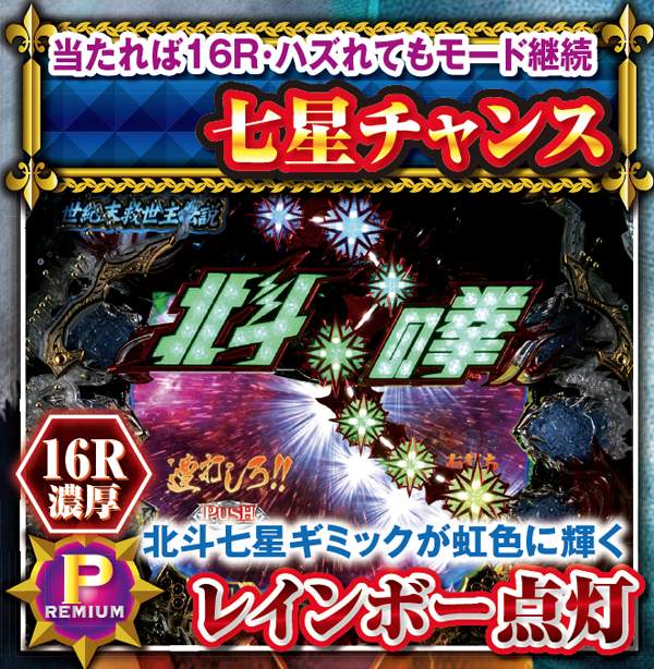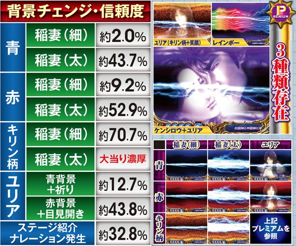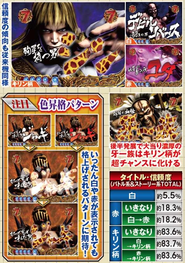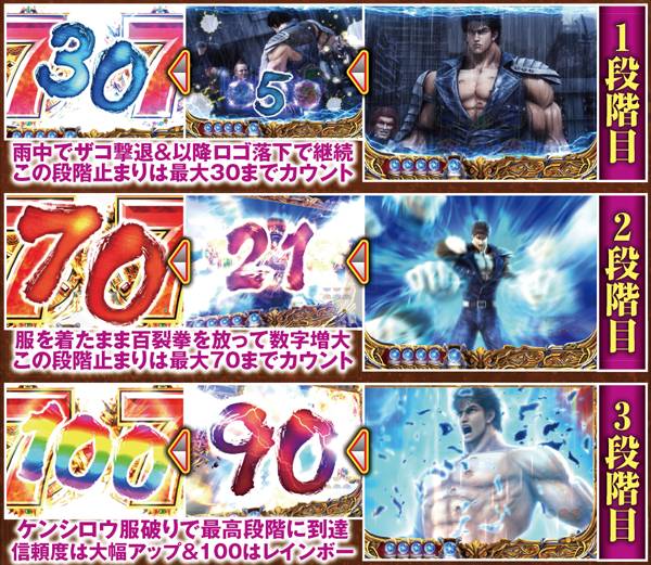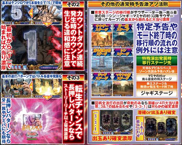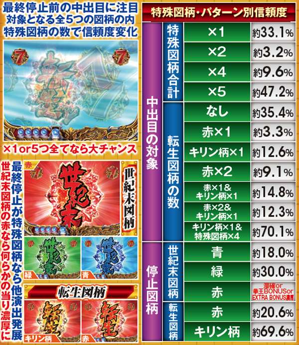 最終的に世紀末図柄停止で世紀末チャレンジへ、転生図柄なら転生チャンスへ発展。停止期待度を特殊図柄の数と色で、その後の信頼度を色で示唆する。キリン柄の転生図柄で激アツ、赤色の世紀末図柄なら何らかの当りが濃厚だ。